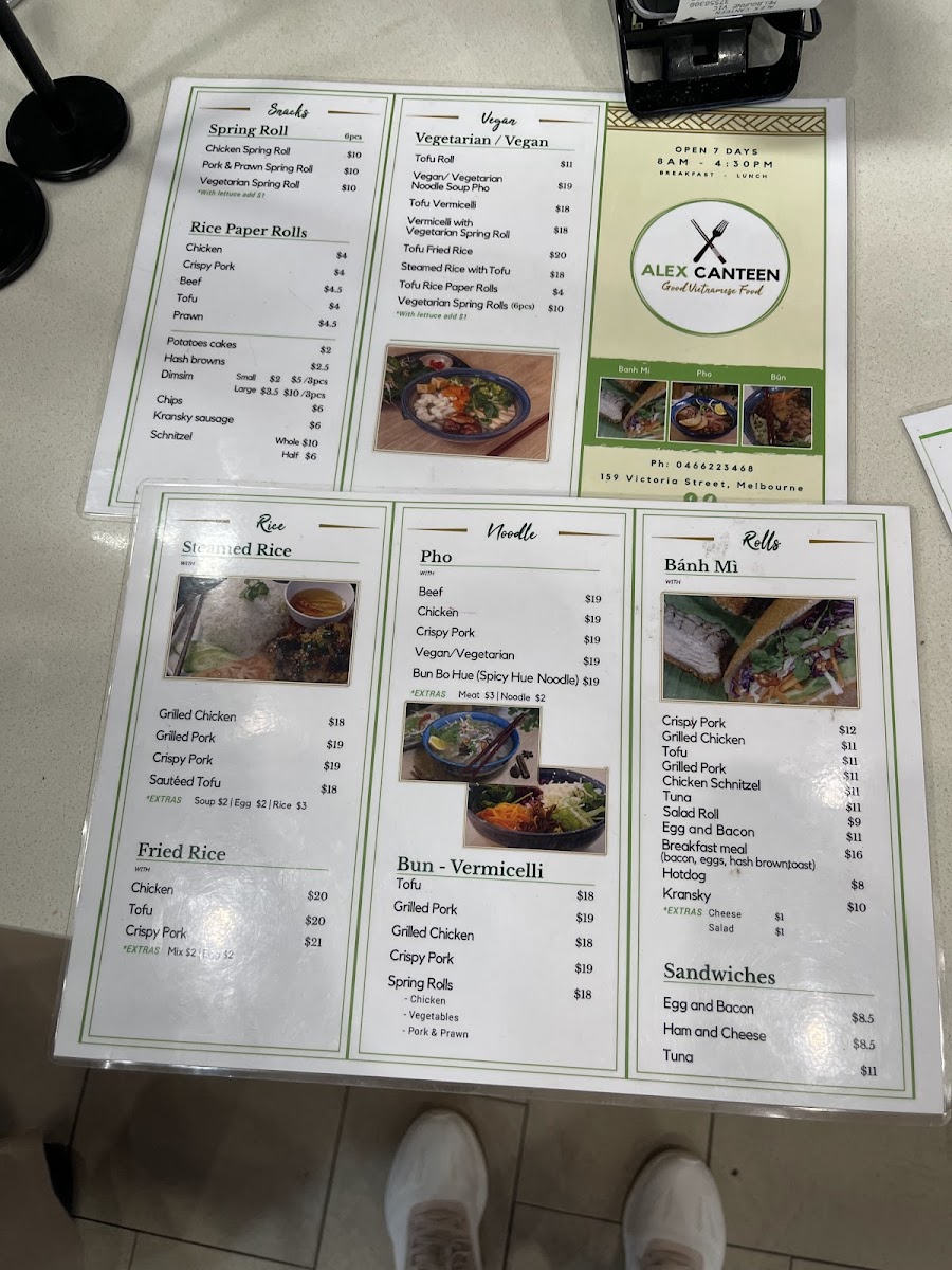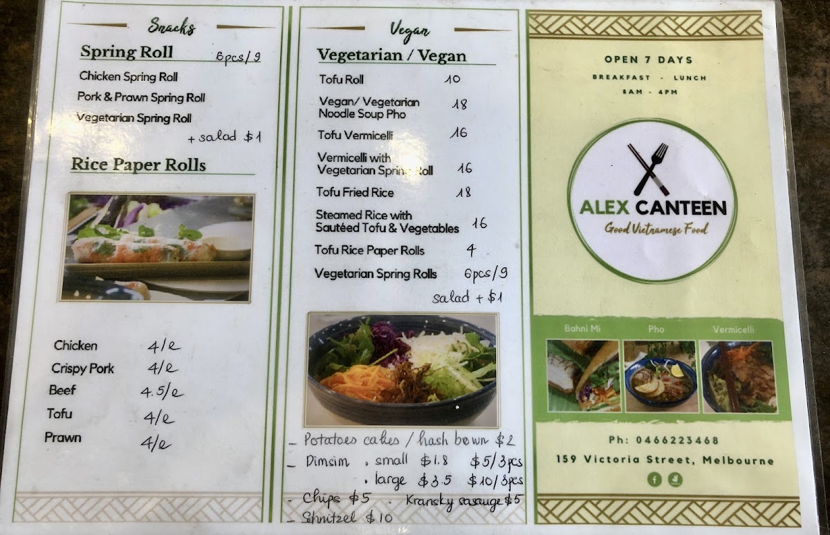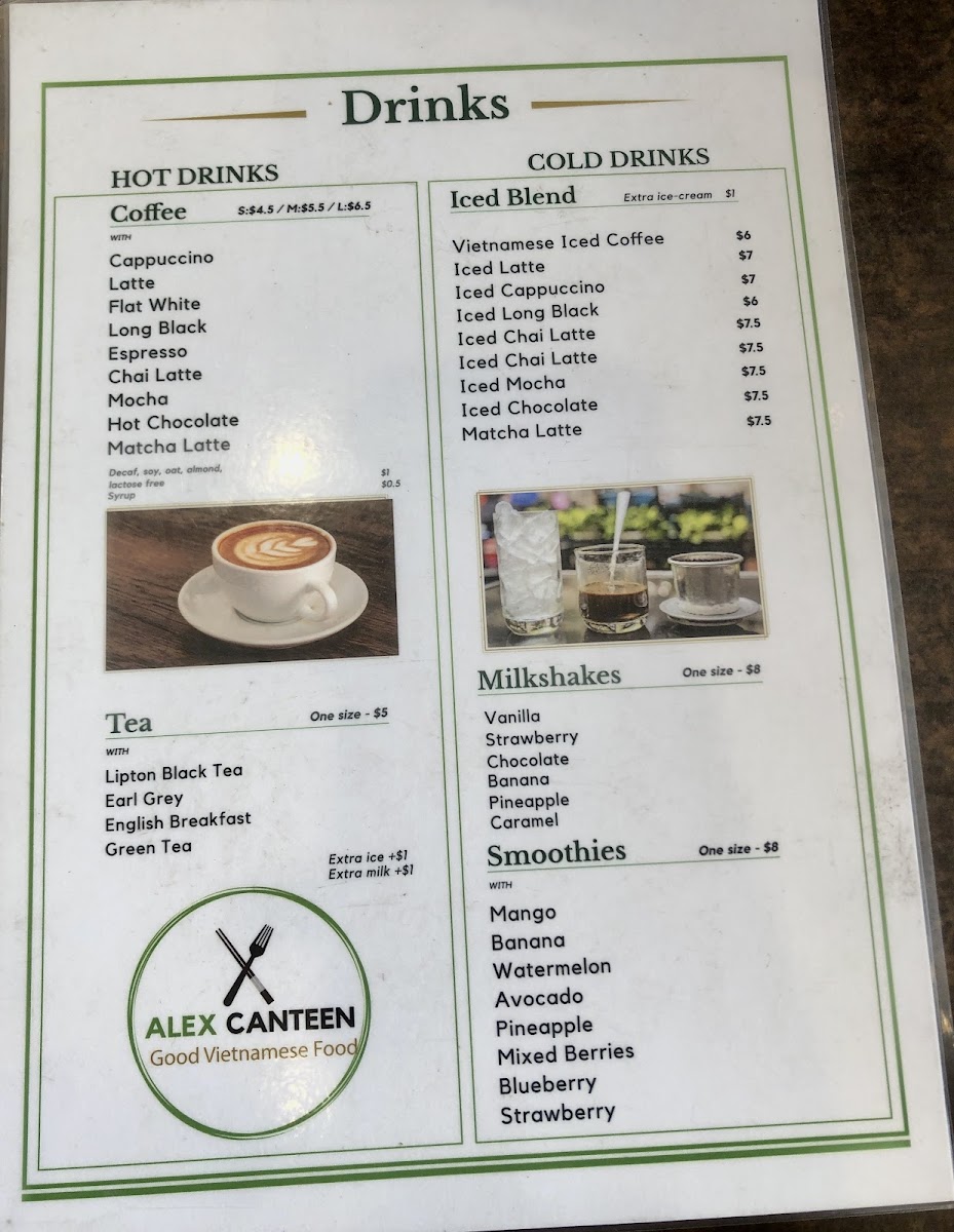 The menu at Alex Canteen offers a straightforward yet satisfying selection of Vietnamese dishes that feel both familiar and comforting. You'll find a range of casual bites and heartier meals, perfect for any time of the day—from a light lunch to a relaxing dinner.